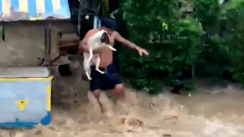 Man rescues stranded dog from typhoon floodwaters in Philipp...