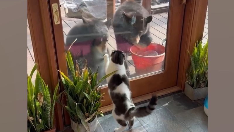 House cat stands ground as young bears visit door