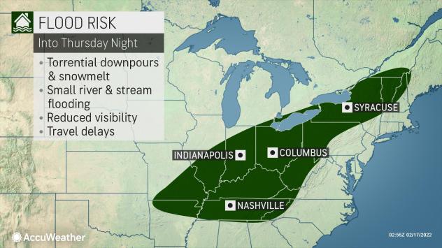 Farther to the north and northeast, there will be little to no risk of severe weather. However, heavy rain will be a threat. This will elevate the flood risk, especially in locations where the ground is frozen and a significant amount of snow remains on the ground. This will cause much of the rain to runoff, which can cause small streams to flood as well as flooding in urban areas.