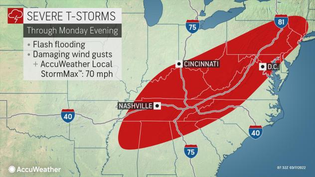 The threat for severe thunderstorms will likely shift eastward on Monday, expanding into portions of the Tennessee Valley and Ohio Valley. Locations from northeastern Mississippi into West Virginia could all be impacted, including cities like Nashville and Charleston, West Virginia.