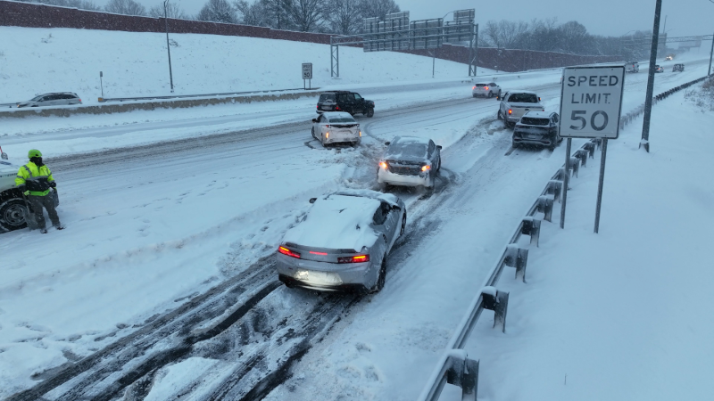 One minute above snow-covered North Carolina interstate show...