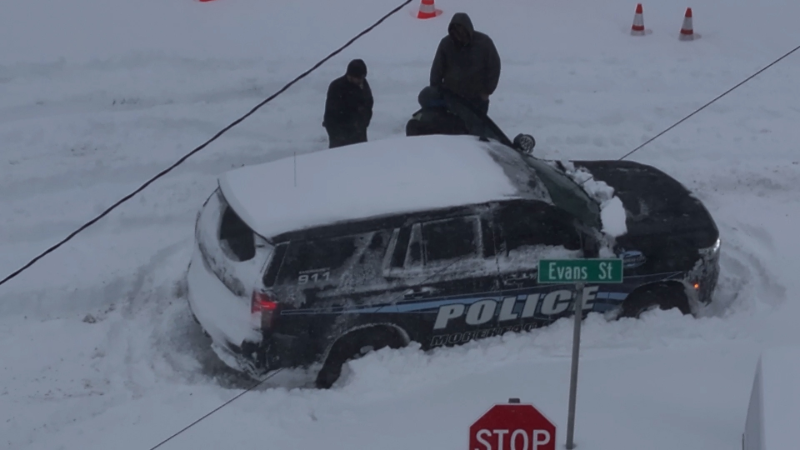 Intense snow strands vehicles, including police cars, across...