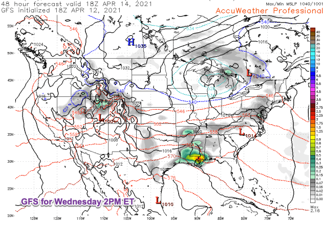 While this could be a heavy, wet snowstorm in parts of that area, the GFS ensemble mean forecast is much tamer. Still it isn't every April 16th when a forecast of snow accumulation can be an item on the Northeast forecast map.