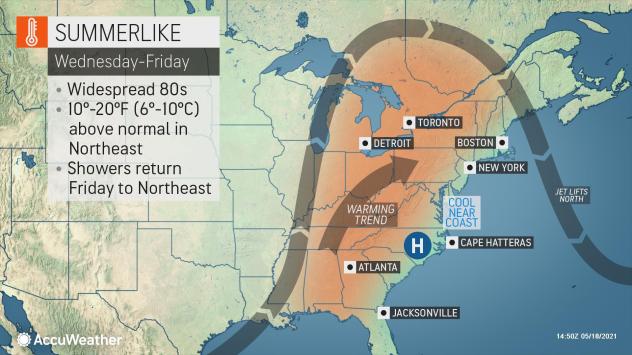 The eastern half of the nation is about to get a full taste of summer two weeks ahead of meteorological summer, which begins on June 1, and six weeks ahead of astronomical summer, which will officially arrive on June 20. AccuWeather meteorologists are forecasting temperatures to surge well into the 80s F over much of the region later this week and into this weekend -- and a few locations may experience their first 90-degree temperature of the season so far.
