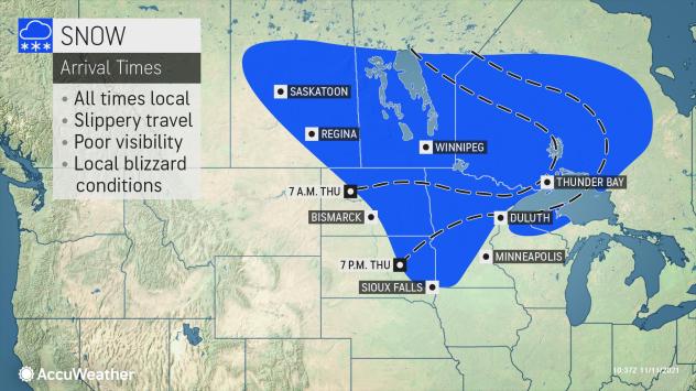 The snowstorm can cause long-lasting travel disruptions in places like Thunder Bay, Ontario, and Winnipeg, Manitoba. Treacherous travel is also likely along the Trans-Canada Highway cutting through southwestern Ontario into southern Manitoba.